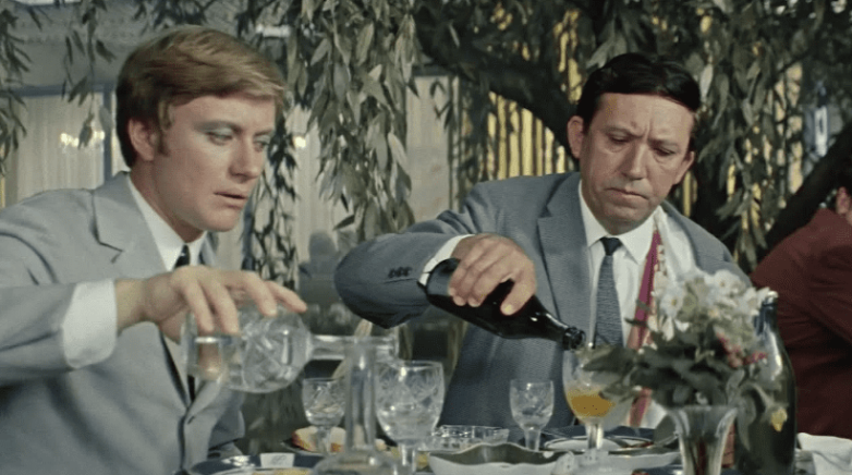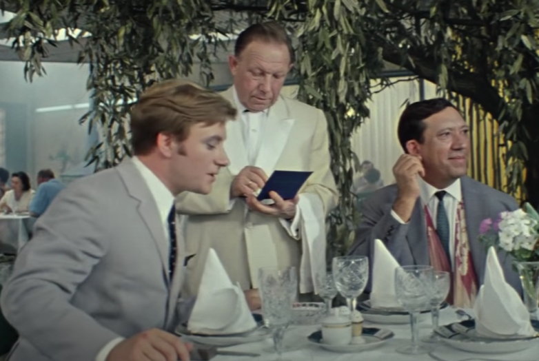 Давайте пробежимся по заказу Геши Козодоева, по ценам того времени и умножим их на два, чтобы получить приблизительные ресторанные расценки. Бутылка водки — 6 рублей, бутылка «Армянского» коньяка — около 10 рублей, две бутылки пива — 2 рубля, бутылка Шампанского — 9 рублей. Также на столе виднеются нарезки из сыра, колбасы и овощей. Оценим все это в 5 рублей. И самое главное блюдо — «Дичь» из утки с грибами и другими изысками оценим в 20 целковых. Итого наш праздничный ужин по ресторанным ценам 1969 года потянет на 52 рубля. А это почти половина официальной зарплаты нашего манекенщика Гены. Завидую, мог себе позволить в 1969 году.