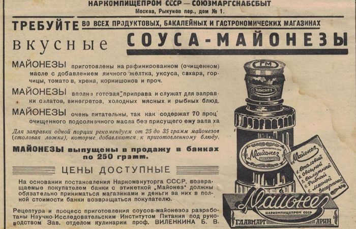 Впервые в Советском Союзе классический майонез появился в середине 30-х годов. Первая партия нового продукта была отправлена Главе правительства СССР Иосифу Сталину. Он оценил вкусовые качества соуса и в Москве запустили массовое производство. Продукт готовили согласно ГОСТу, а значит, в его составе должны были быть исключительно натуральные компоненты — подсолнечное масло, яйца, горчица и специи. Примечательно, что срок годности у натурального майонеза составлял 30 дней, поэтому закупить впрок его не удавалось.
