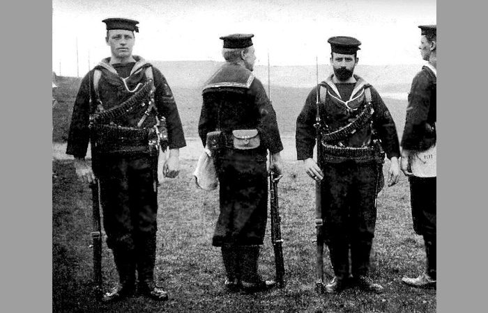 Поначалу моряки отправлялись в бой со своим штатным оружием, которое не очень хорошо подходило для подобных боевых действий, а потом ситуацию исправили и стали снабжать полноценным пехотным оружием. Правда, снаряжения всё равно не хватало, и приходилось идти с тем, что было под рукой, а намотанная вокруг пояса или через плечо пулемётная лента – это всего лишь ещё один способ носить с собой боеприпасы.