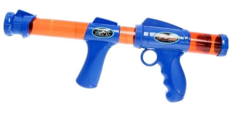 Эта очень приличного калибра система стреляла пластмассовыми шариками, которые выталкивались сжатым воздухом. Воздух сжимался за счет движения передней рукояти. ем на переднюю рукоять.