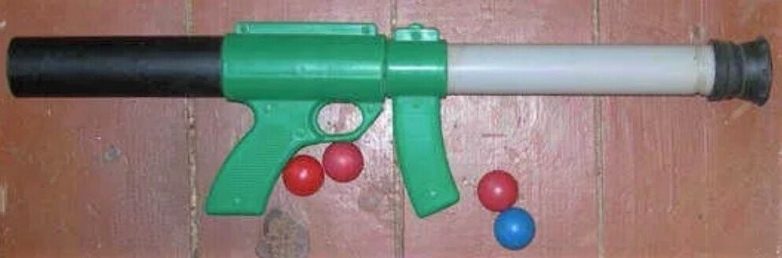 Я держал это оружие в руках очень давно, и не помню, чтобы в нем были шарики. Но, как говорят, шарик летел довольно сильно, и некоторые взрослые даже охотились с помощью этого «шарикомета» на мух.