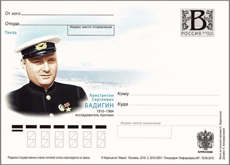 Почтовая карточка, выпущенная к столетию со дня рождения К. С. Бадигина. Россия, 2010 г.