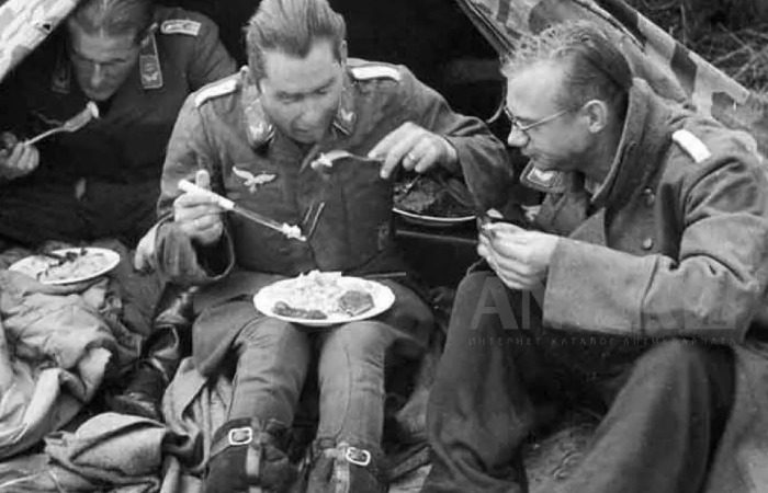 В Вермахте офицеры с генералами ели то же, что и солдаты, и только в конце войны составили четыре комплекта. Выигрышная ситуация немецких войск в первые годы, когда армия Вермахта оказалась сытой за счет оккупированных богатых территорий СССР, в конце войны пожинала результаты своих действий – в рационе остался водяной суп, 200 граммов хлеба и 50 граммов колбасы. Советская армия использовала другой подход и выиграла от этого.