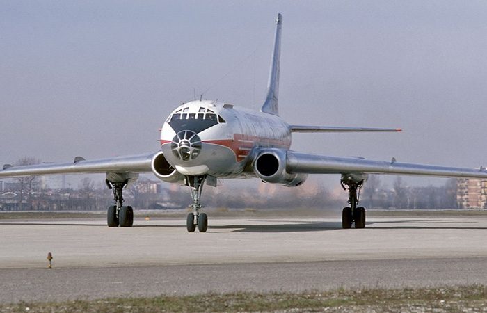 Аналогичную компоновку использовали в советском лайнере Ту-104, который построили из бомбардировщика Ту-16. Здесь двигатели встроили в силовую конструкцию: конструкторам так проще было переделать военный самолёт в коммерческий авиалайнер без радикального изменения изначальной схемы.