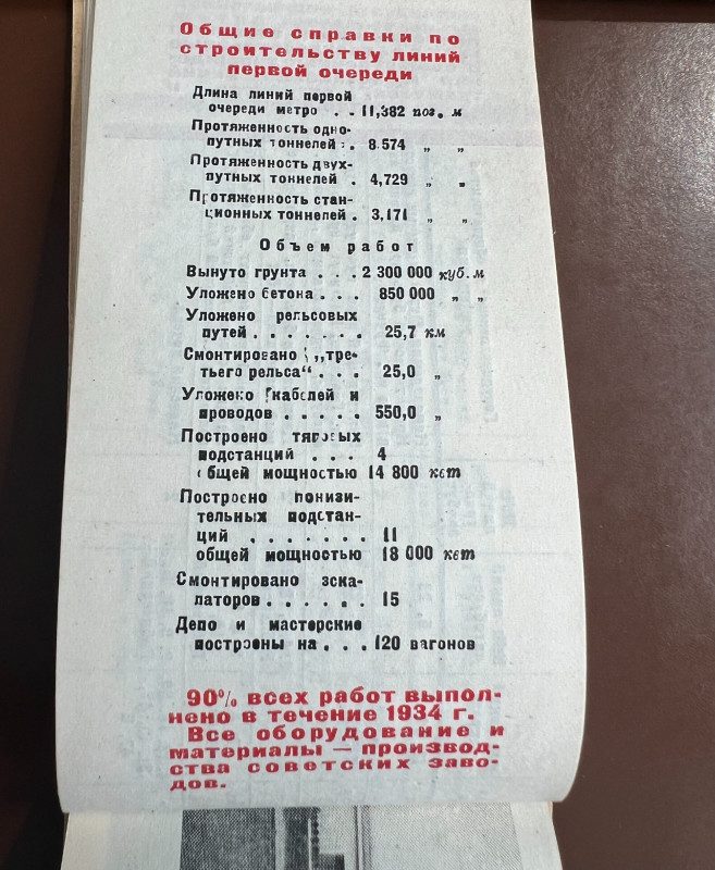 Итак, в метро было два маршрута: «Сокольники» — «Парк Культуры» и «Сокольники» — «Смоленская». Составы по линии курсировали с 7 утра до 1 часа ночи. На участке «Сокольники» — «Охотный ряд» поезда следовали с интервалом 5 минут. Между другими станциями — 10 минут. На первых страницах путеводителя людей встречали изображения И.В. Сталина, Л.М. Кагановича, Н.А. Булганина и Н.С. Хрущёва. Пару слов написали о благодарности компартии, похвалили инженеров и рабочих за небывалый энтузиазм, а также уверяли пассажиров, что при строительстве Московского метро никакой иностранной помощи не было. Последнее утверждение не являлось до конца правдивым. Здесь мы останавливаться на этом не будем. Но достаточно заглянуть хотя бы в источники 1930-х годов, где рассказывали о строительстве Московского метро.